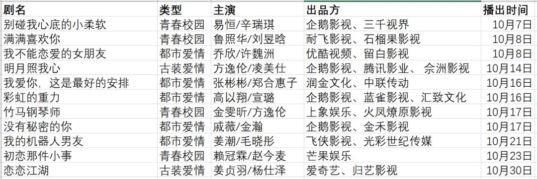 如今在播的剧中,也或多或少打过“甜宠”这一宣传点。娱乐资本论梳理了十月份上线的11部甜宠剧,得到下表: