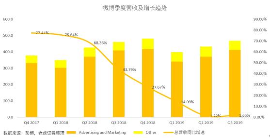 微博的主营广告业务4.125亿美元,同比仅增1%。