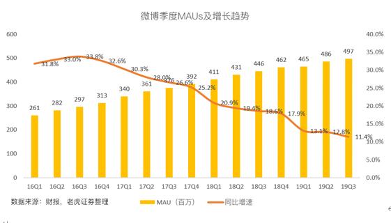 微博Q3 MAUs尽管达到4.97亿的庞大,增速也一路下滑不带回头,见顶压力一直有的。