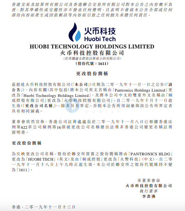 桐成控股自11月18日起股份简称变更为“火币科技”
