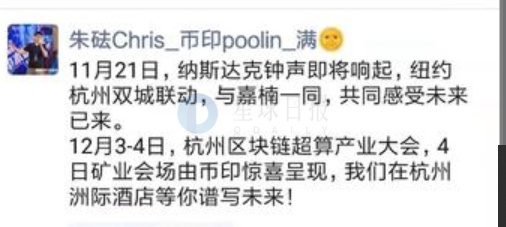 11月14日,币印矿池联合创始人朱砝发布朋友圈称:“11月21日,纳斯达克钟声即将响起,纽约杭州双城联动,与嘉楠一同,共同感受未来已来。”