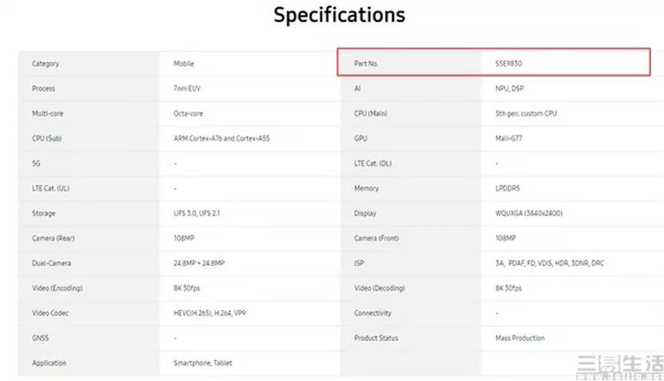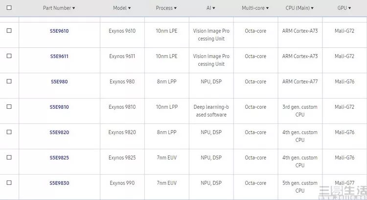 但是如果大家进一步观察这张表格里其他三星处理器的信息,就会意识到新的问题,除了Exynos990(S5E9830)之外,其他的处理器它们的“型号”和“部件号”都是完全相同的,只有Exynos990出现了最终命名型号和部件号对不上的情况。为什么会这样呢?