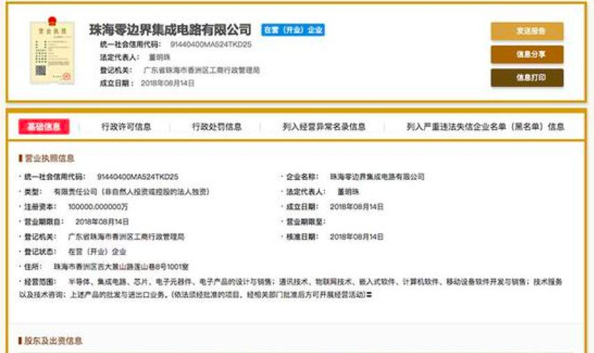 2018年8月14日,一家名为“零边界集成电路”的有限公司成立,注册资本为10亿元,经营范围为半导体、集成电路、芯片、电子元器件以及电子产品的设计与销售。