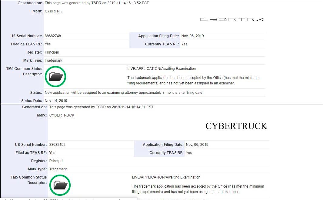 美国专利商标局网站显示,特斯拉于11月6日提交了两个商标申请,分别为 CYBERTRUCK 和 CYBRTRK。风险投资人 Jonathan Drake 12日在推特上透露, 特斯拉为皮卡申请的新商标为 CYBRTRK,特斯拉皮卡后续或将以此命名。
