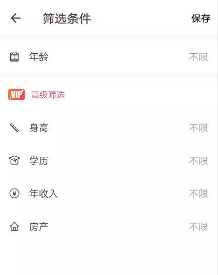 除了更多匹配机会和曝光资源,牵手恋爱给予VIP更多主动权,他们可以筛选“学历”、“年收入”和“房产”条件,只接收能满足自己物质条件要求的用户推荐页。
