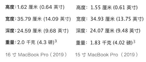 显示屏变大了,但苹果并未让机身有太大变化,16 寸的长宽高分别是35.79cm、26.59cm、1.62cm,重量为 2kg,而 15 寸则为34.93cm、24.07cm、1.55cm,重量为 1.83kg。几乎是在 15 寸的机身内塞入了一块 16 寸的屏幕。