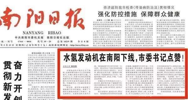 今年5月23日《南阳日报》头版发布《水氢发动机在南阳下线,市委书记点赞!》一文,称水氢发动机在南阳市正式下线,意味着车载水可以实时制取氢气,车辆只需加水即可行驶。文章引发广泛质疑。有网友认为,这又是一个“水变油”神话。