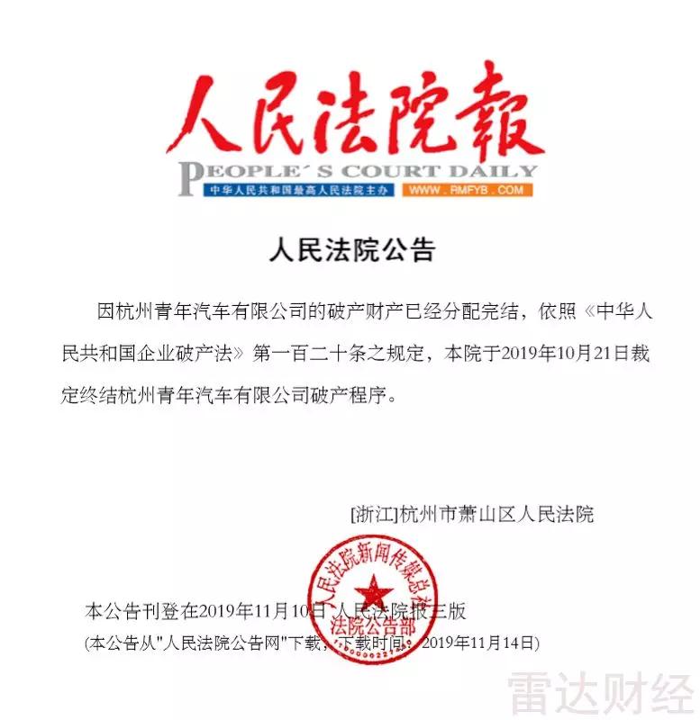 11月14日,雷达财经从人民法院网获悉,因杭州青年汽车有限公司的破产财产已经分配完结,依照《中华人民共和国企业破产法》第一百二十条之规定,法院于2019年10月21日裁定终结杭州青年汽车有限公司破产程序。