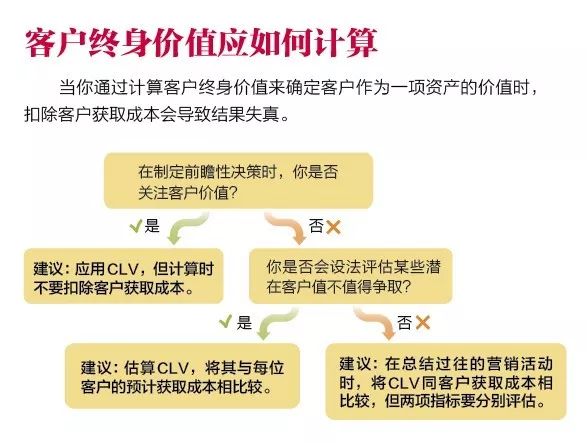 营销人员经常利用CLV在客户获取活动中确定目标客户。我们对这些营销人员的建议是,计算CLV的依据应该是客户关系的价值,而不是用客户关系价值减去获客成本。