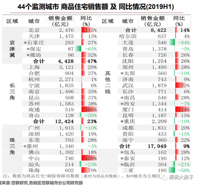 看上图列出的代表城市,2019年上半年,商品房销售额同比下滑的城市还真的是屈指可数,大部分同比都是上涨的,因为都是经过了两年调整了。