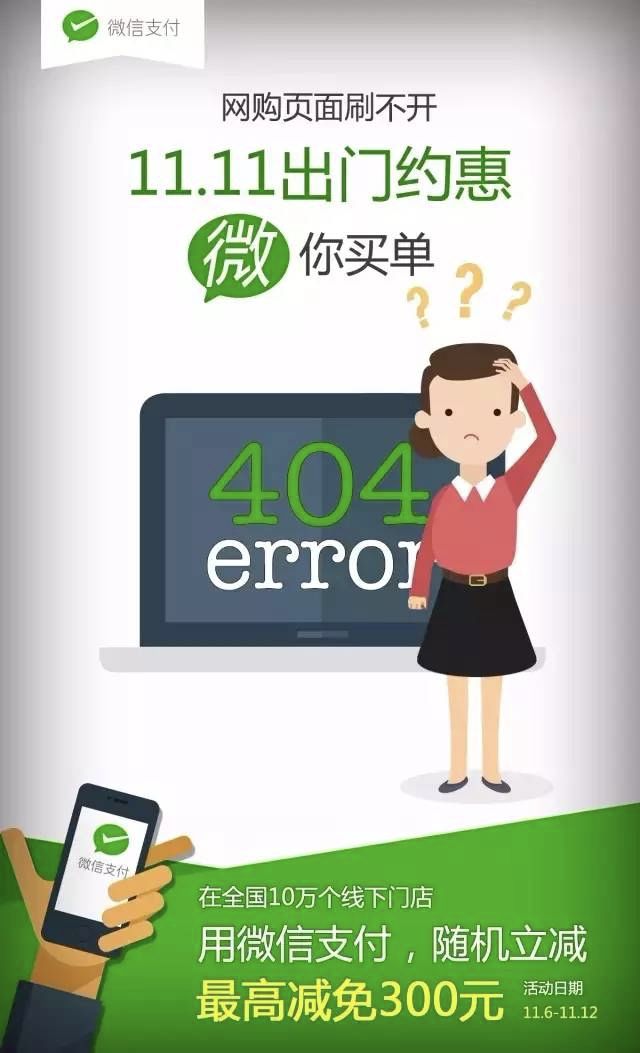 2015年“双十一”微信支付的海报,线下已经有10万个商家参与活动