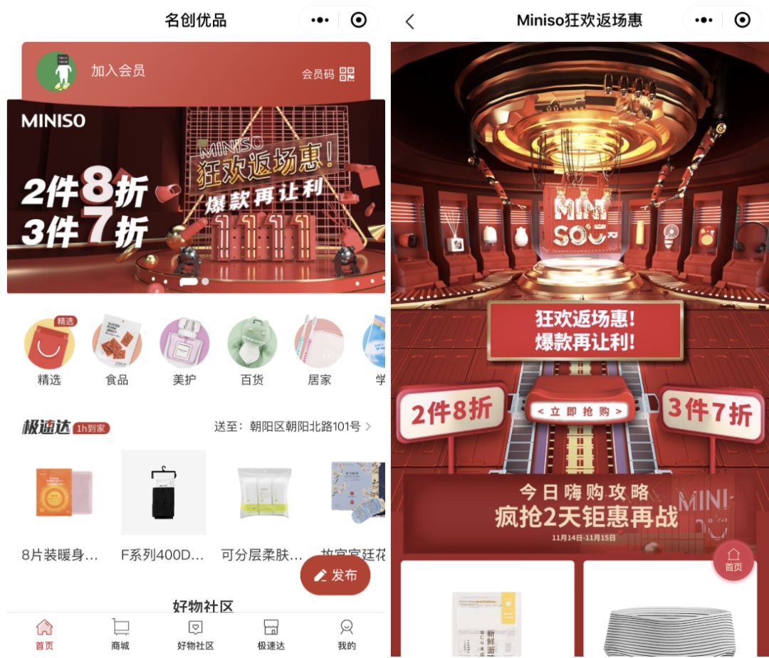 比如说,通过支付工具实现线上引流、线下核销,就是今年比较常见的一个玩法。譬如这两年名声大噪的名创优品,在今年11.1至11.11期间采用了「小程序领券+线下核销」的方式进行了大规模、大力度促销。