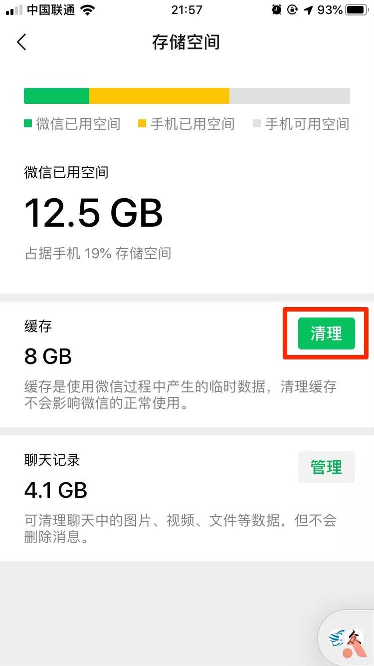 在老版本的微信,相信很多人在清理微信缓存的时候都会担心是不是会把聊天记录删除掉,新版本的微信明确告诉你不会,所以大胆清除吧!坏处只是需要花点流量重新下载头像、朋友圈图片和视频等。清理位置在「我」 - 「设置」 - 「通用」 - 「存储空间」 - 「缓存清理」。