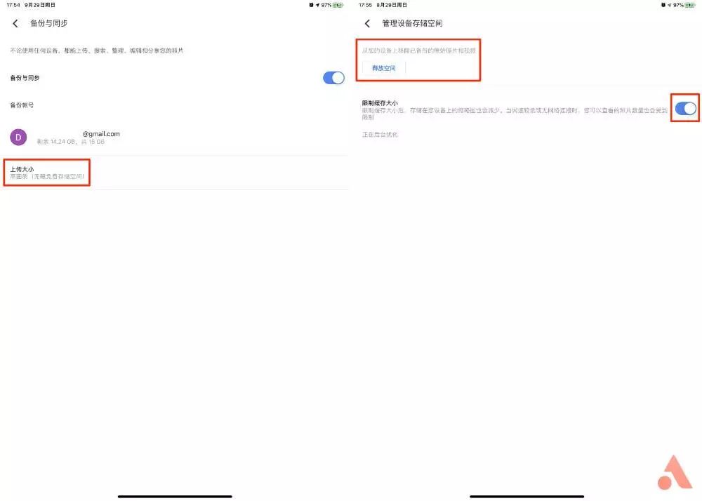 当然,如果你有条件的话,还可以直接下载《Google 相册》,在「设置」 - 「备份与同步」中选择上传「高画质(无限免费存储空间)」,然后在「设置」 - 「管理设备存储空间」中释放空间,并限制缓存大小,这样就能实现无限拍照了!当然,前提也还是对本地图片没有太大需求。