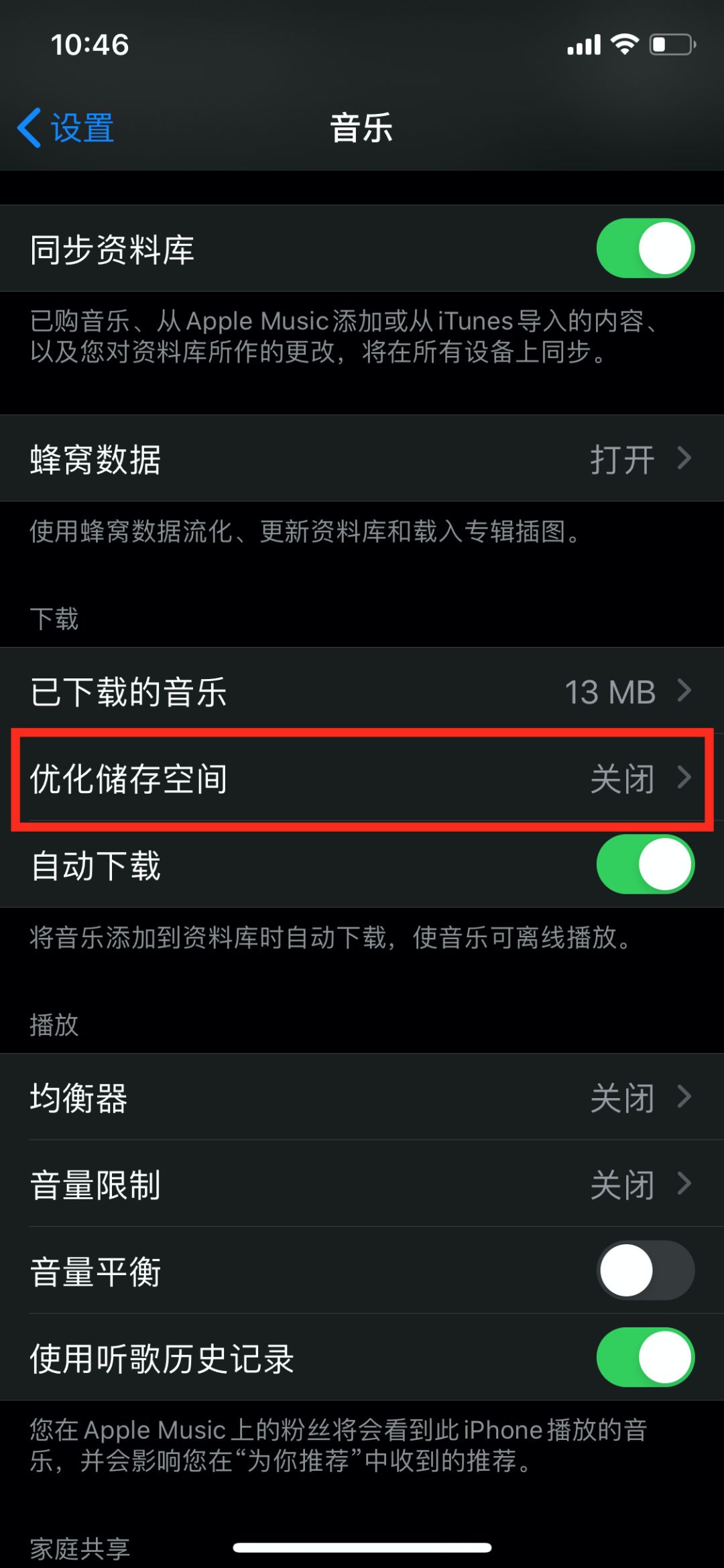 Apple Music 用户还可以到「设置」 - 「音乐」 - 「优化储存」限制从 Apple Music 中下载歌曲的最大占用空间。开启后,当超过该限制就会自动删除很久没听的老歌了。