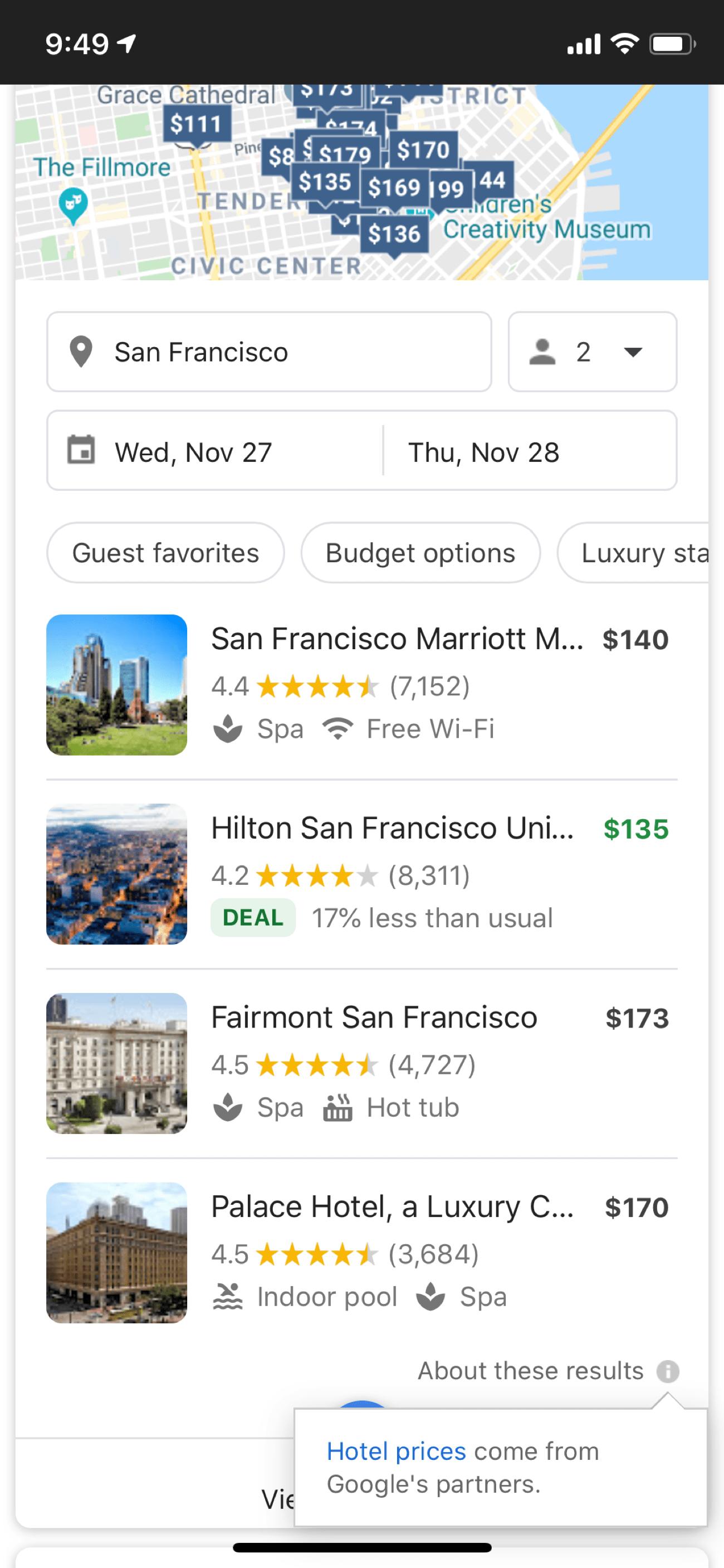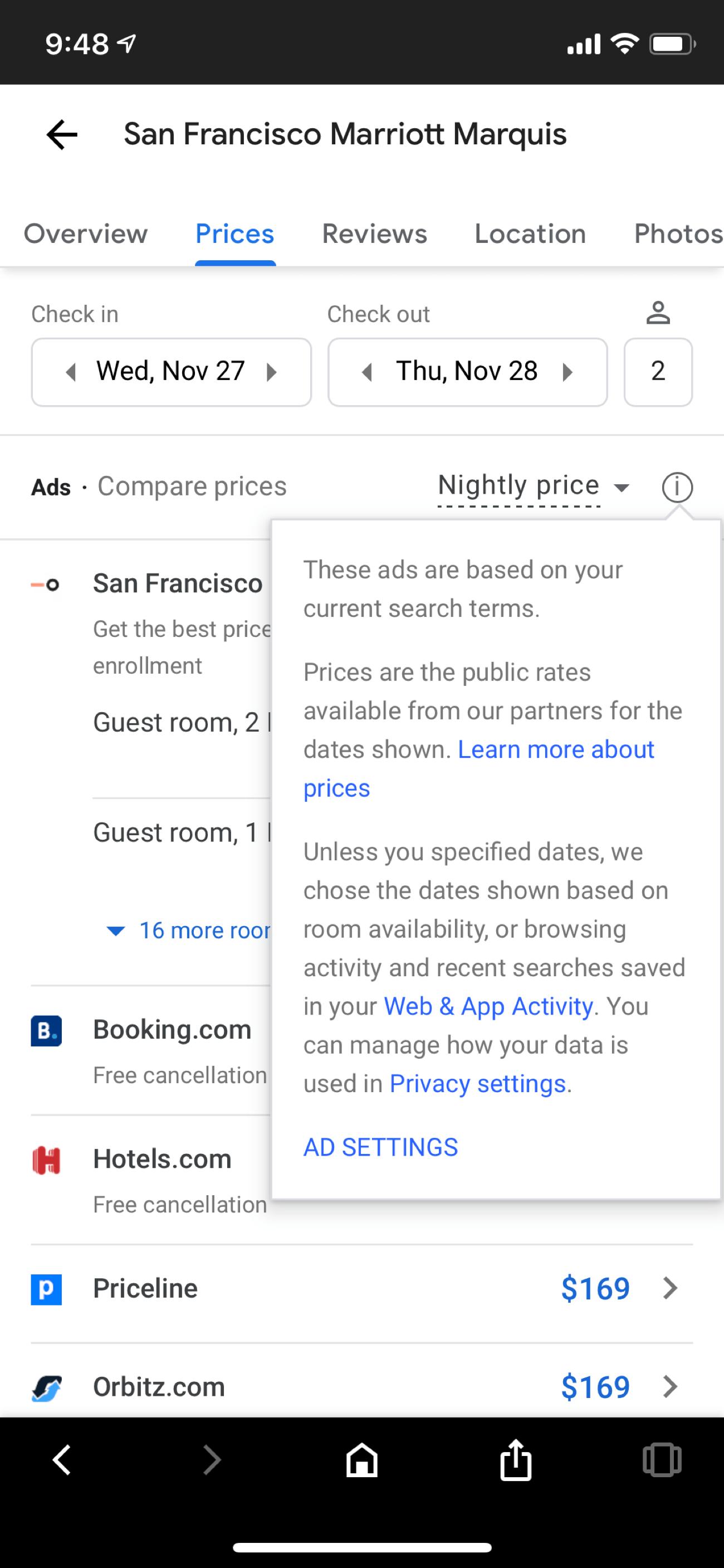 如果你不确定“谷歌合作伙伴”是什么意思,这里有一个截屏,当你点击其中一家酒店,查看价格的时候: