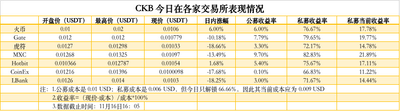 截至发稿前,CKB 在各交易所均价维持在 0.01 USDT 附近。其中,火币报价 0.0106 USDT,今日涨幅 6%;Gate.io报价 0.0107 USDT,今日跌幅 10% ;其他交易所表现如下所示: