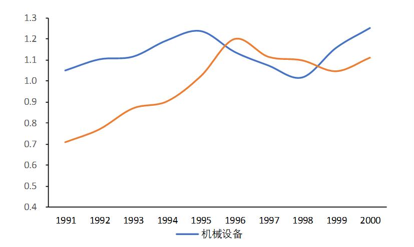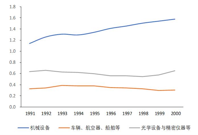我们发现在90年代前半程,台湾与韩国均出现了劳动密集型行业RCA的快速下降,后半程RCA开始平稳。与此同时,技术密集型行业的RCA在这个阶段则出现了不同程度的上升。