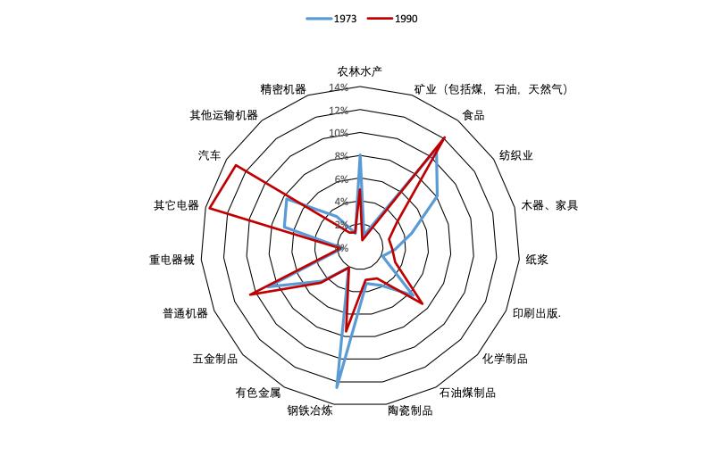 在产业外迁过程中,日本劳动密集型与资本密集型行业中行业份额减少,比较突出的集中在纺织业、钢铁、木材与纸制品,高技术行业权重在这个过程中逐步提升,经济结构持续升级。