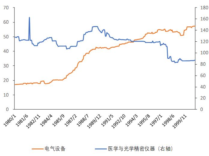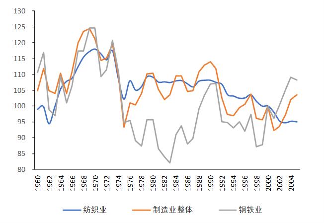 日本纺织业则是在70年代出现快速下行,钢铁在70、80年代左右下行至低位。从60年代到2000年初,制造业整体产能指数经历了两轮波动,其中,第二轮制造业产能指数的提升背景是高技术行业(机械相关)的产能指数上行。