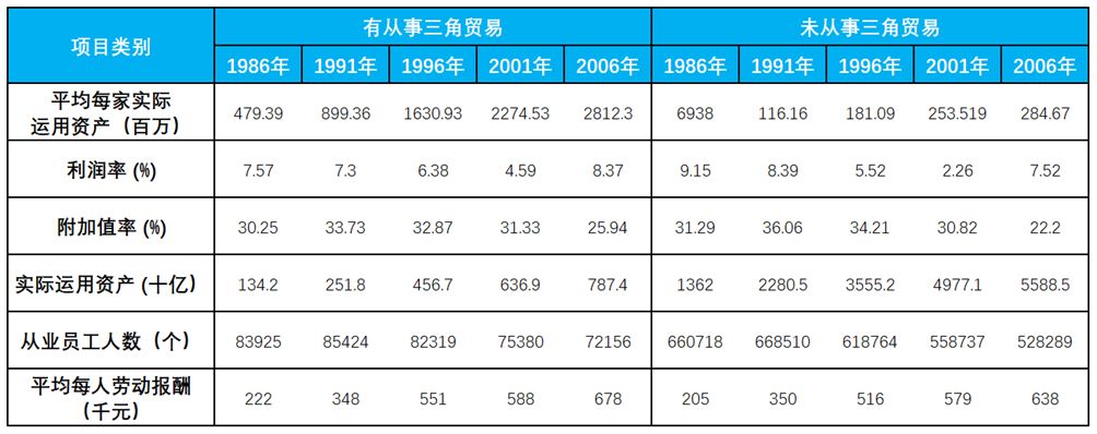 我们通过对比涉足三角贸易与未涉足的企业经营情况,可以看出对外投资力度较高(充分利用外部优势资源)的企业在利润率、附加值率的上升上都战胜了其他企业。