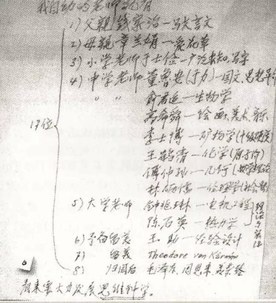 ▲ 钱学森写下对自己影响至深的17名老师