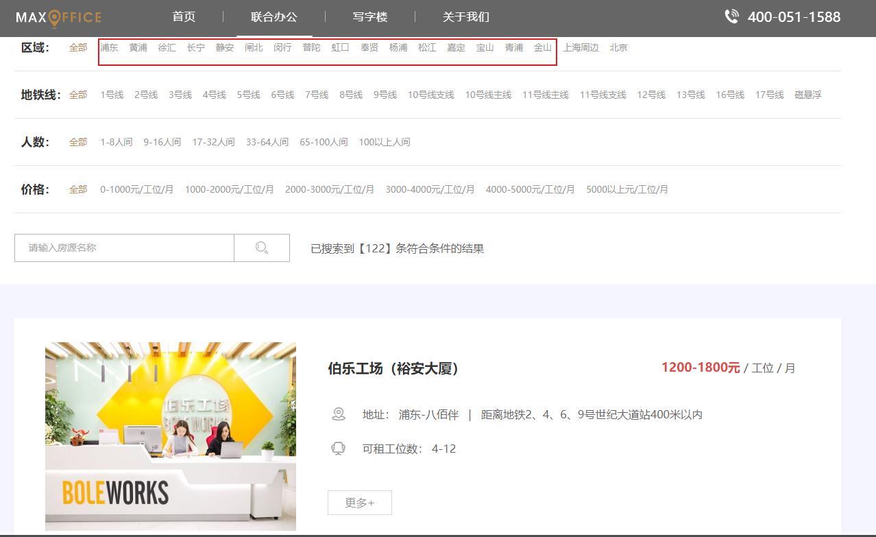 截至发稿前,数办科技官网已经上线了联合办公和写字楼两个频道。其中,写字楼频道收录了69栋写字楼,联合办公频道收录了122套房源。目前,该平台的招商业务仅覆盖上海,上海周边以及北京暂时还没有收录相关房源。