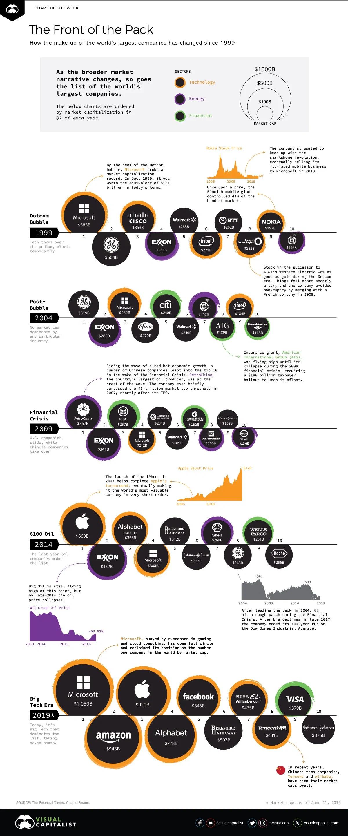 1999年,正是历史上最大的科技泡沫的前夕,前十大市值公司中已经有五个是科技股,随后,科技股泡沫破裂,开始进入调整期,2004年前十占比最高的是金融股,2009年前十占比最高的是能源股,彼时,新一轮的移动互联网已经开始孕育,到了2014年,科技股又开始重新崛起,前十中已经有三家,到了2019年,借着移动互联网的东风,前十中已经占据了七家。