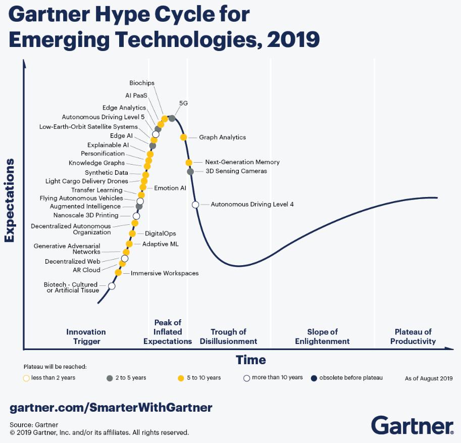 Gartner公司是全球知名的IT研究与顾问咨询公司之一,Gartner每年会根据分析预测把各种新科技的发展阶段及要达到成熟所需的时间绘制在一条曲线上,这条曲线被称为“Gartner新兴技术成熟度曲线”(The Gartner Hype Cycle for Emerging Technologies),通过这个曲线可以更好的把握科技的趋势,从2019年新兴技术成熟度曲线来看,未来5至10年内有五个主要的趋势:1)感知和移动性、2)人类增强、3)后经典计算与通信、4)数字生态系统、5)高级AI和分析。