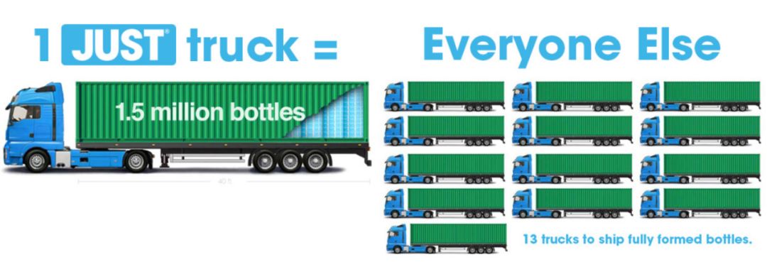 1辆卡车可运输1500万瓶JUST WATER包材,而相同数量塑料瓶需13辆卡车,图片来源:JUST WATER官网