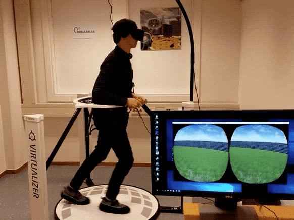 实验者穿着摩擦非常低的鞋套,被安全带固定在运动平台上,可以自由旋转变换方向,这样他们就能在VR世界中行进了。