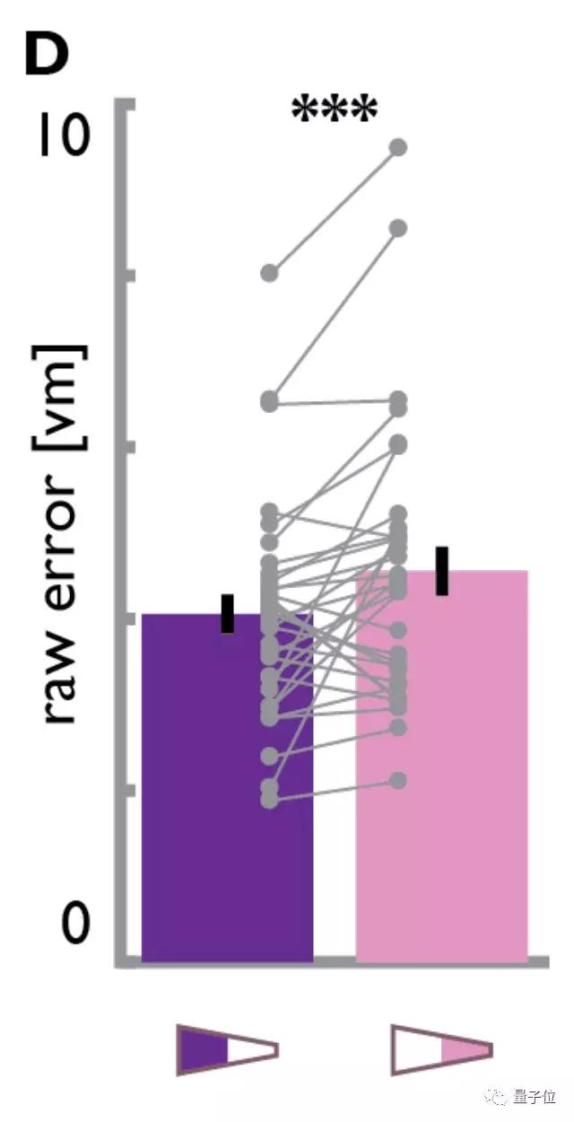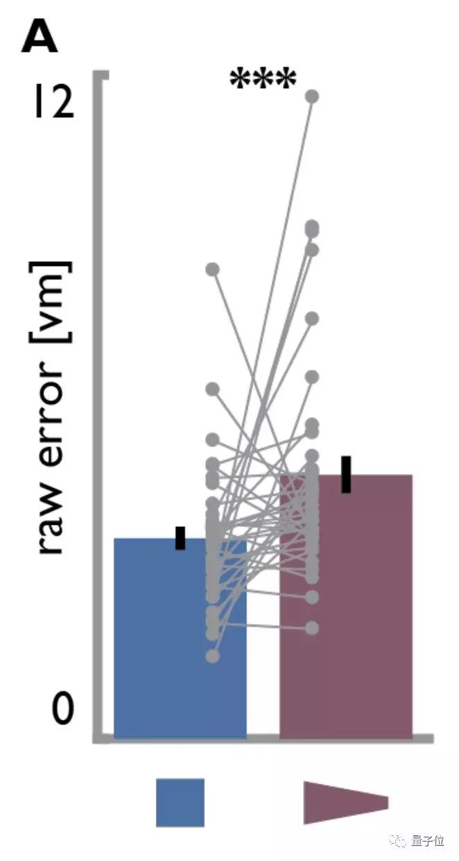 之后,通过各种数学方法统计出参与者们走到目标位置的准确程度,发现,在正方形环境中,参与者的错误率是明显低于梯形环境的。