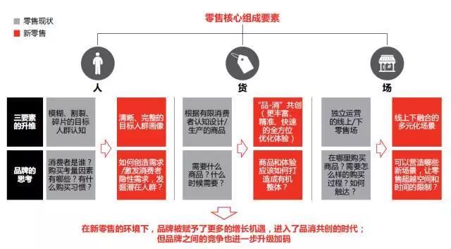 新零售的人、货、场(通过移动互联网展现媒体内容工具,匹配海量用户大数据和行为偏好轨迹,通过算法捕获存量精准用户并不断用交叉营销获取增量用户)。