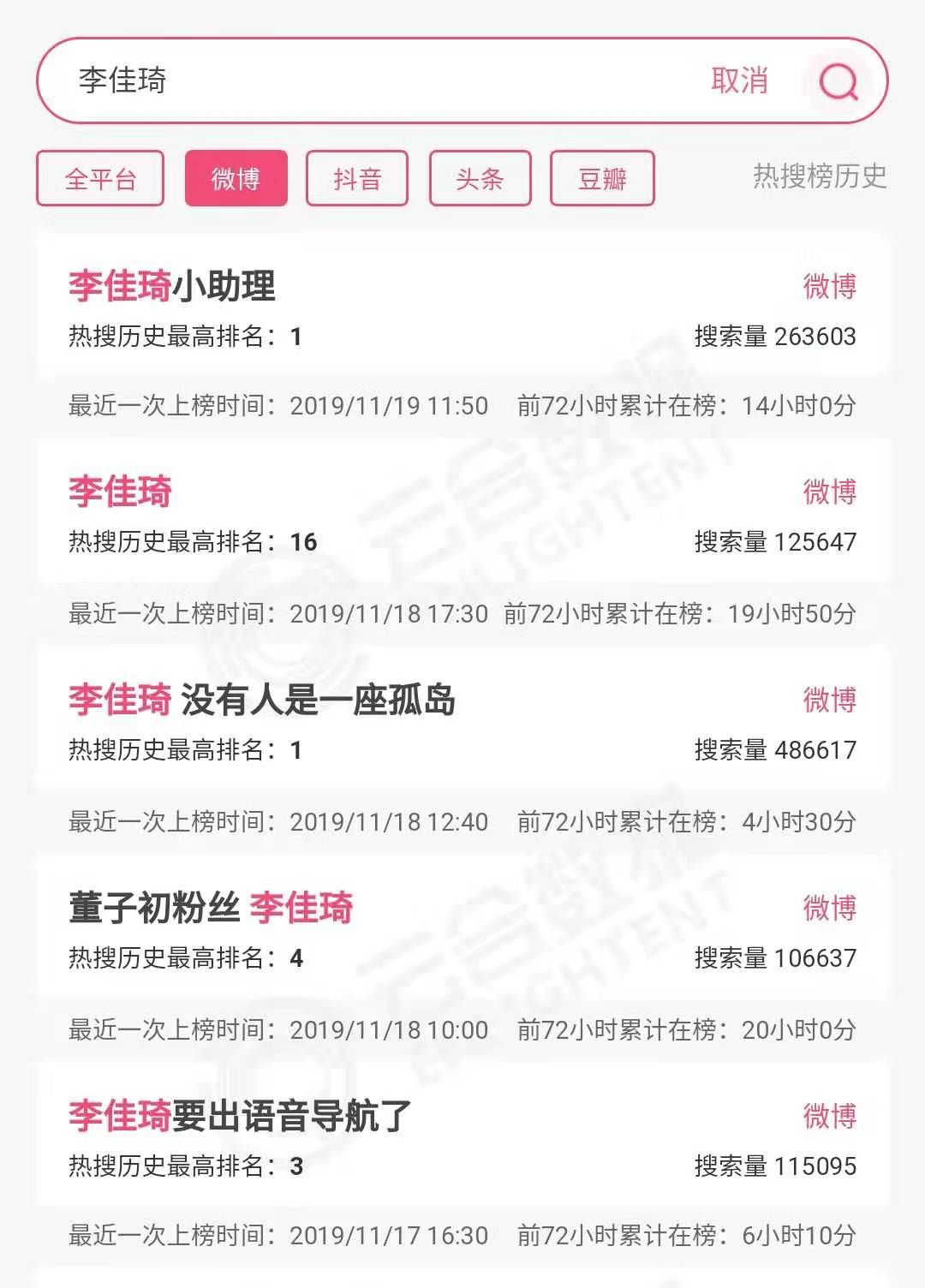 第三个爆发点是以微博为代表的全域社媒。粗略统计双11期间(10.21-11.11),李佳琦登上微博热搜榜第1位的话题。