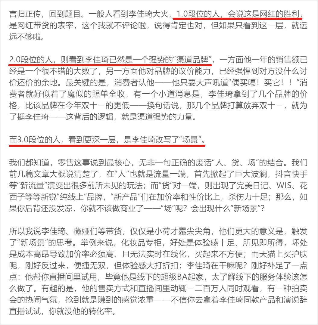 雕爷口中的1.0网红带货、2.0渠道品牌、3.0改写场景,从我们看来真不是太神奇的事,那是对于一个优质内容电商的准入门槛。而这些,已经在李佳琦的能力圈内。