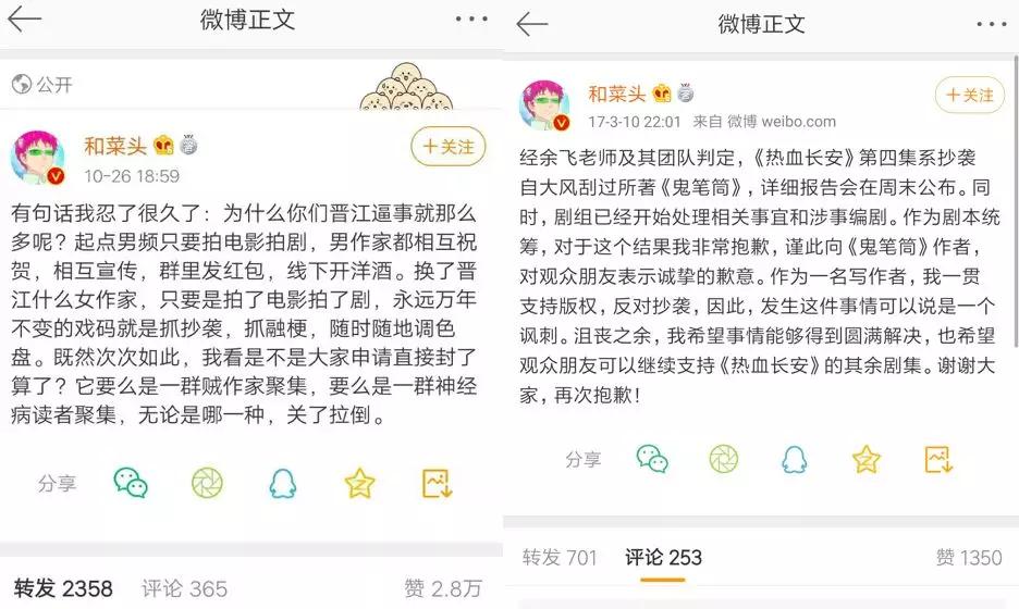 在《少年的你》融梗争议正热的时候,「和菜头」曾发布微博,称「起点男频只要拍电影拍剧,男作家都相互祝贺,相互宣传,群里发红包,线下开洋酒,换了晋江什么女作家,只要是拍了电影拍了剧,永远万年不变的戏码就是抓抄袭、抓融梗,随时随地调色盘。」