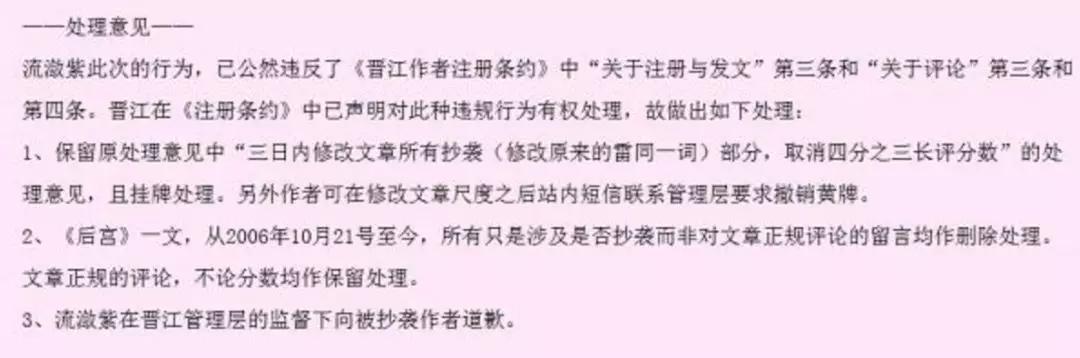 当月下旬,晋江管理层出具了针对《甄嬛传》的处理公告,主要包括三点:一是让作者流潋紫在三日内修改文章所有抄袭部分;二是删除原文下所有只是涉及是否抄袭而非对文章正规评论的留言;三则是希望流潋紫在晋江管理层的监督下向被抄袭作者道歉。