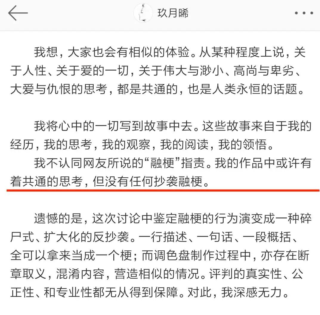 自此,融梗一词诞生。随着电影《少年的你》口碑的水涨船高,关于「融梗与抄袭」的争议越来越大,面临不断升温的舆论,玖月晞做出了回复。