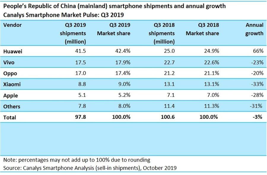 随着华为加大对国内市场的投入,以及在消费者情怀的加持下,华为手机在国内市场取得了意料之中的爆发式增长。科技市场研究公司Canalys最新发布的数据显示,2019年第三季度,华为在中国智能手机市场同比增长高达66%,而VIVO、OPPO、小米和苹果均出现大幅下滑,华米OV和苹果之外的市场空间也进一步萎缩。市场调研机构Countpoint最新发布的数据也与此相近,手机行业的这个寒冬更冷了。