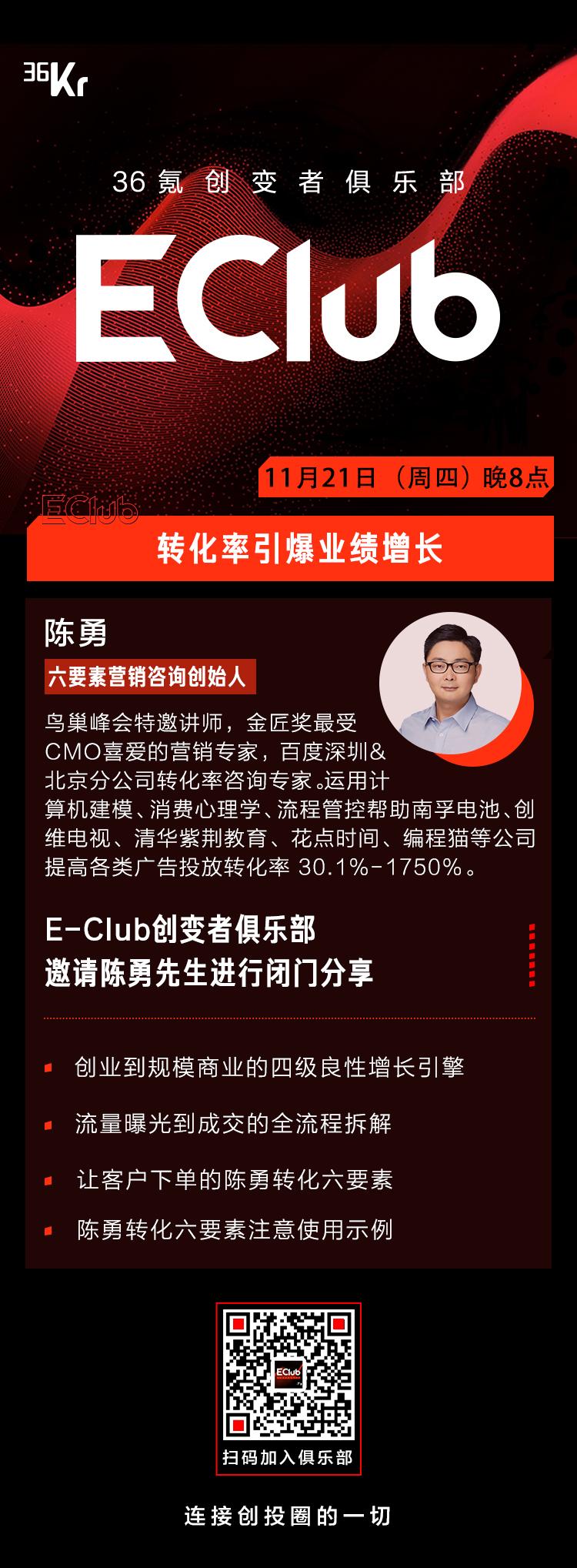 欢迎成为36氪[E-Club创变者俱乐部]一员,享受36氪生态资源带来的长期赋能。