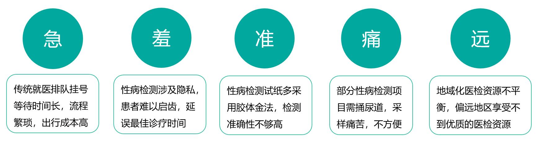 据 WHO 统计,全球每年约有 3.57 亿人新感染衣原体、淋病、梅毒和滴虫四种性传播感染中的一种。t同时,全球每天新发性传播疾病 100 万人,中国每年新增梅毒病例 50 万人,中国艾滋病感染人数 125 万人。随着性疾病的病例的增加及普及,社会对于性疾病的态度不再只局限于发病后的治疗,而是更侧重“早发现、 早治疗、早预防、早健康”的健康观念。