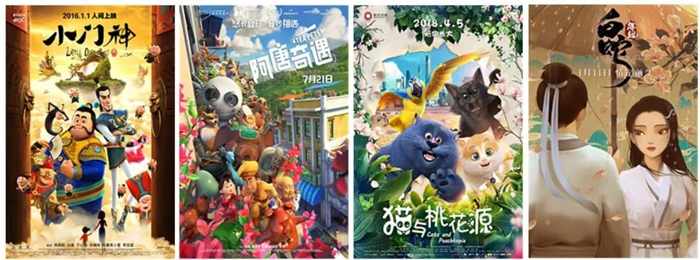 从左至右:《龙神之子》《西游记之大圣闹天宫》《西游记之再世妖王》《木兰:横空出世》