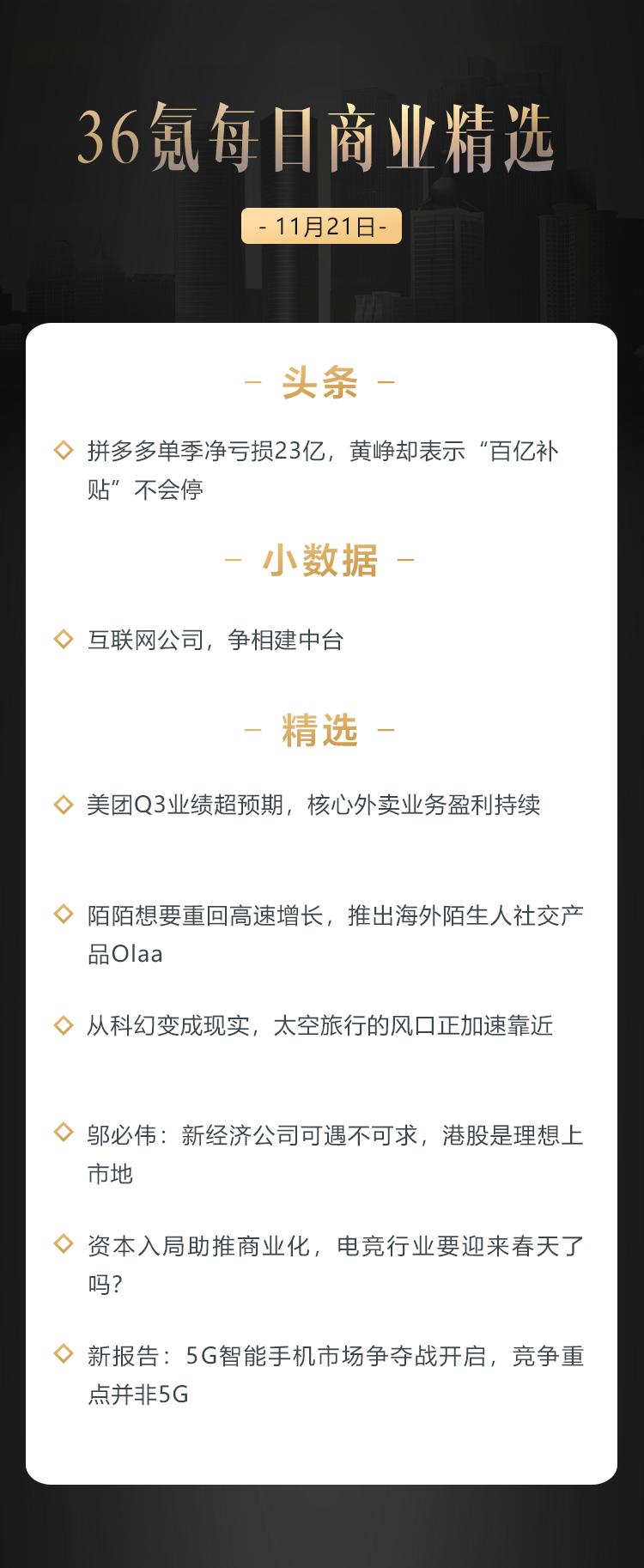 本文来自36氪付费栏目《36氪每日商业精选》——11月21日