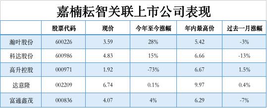 不过,到了当日收盘前 1 小时,嘉楠耘智部分关联企业股价却出现瀑布式下跌。最终,瀚叶股份(600226)收涨 1.87%、科达股份(600986)收跌 3.57%、高升控股(000971)收跌 1.06%、富通鑫茂(000836)收跌 2.97%,达意隆(002209)收跌 2.21%。