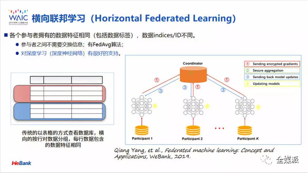 联邦学习主要分为三个模式,第一种被称作横向联邦学习,一般应用于用户重叠较少、但用户特征重叠较多的数据集。