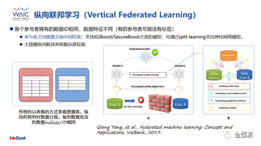 第二种模式则被称为纵向联邦学习,应用于用户特征重叠较少、但重叠用户多的数据集。