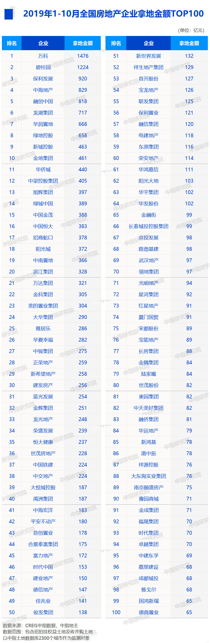 从销售端看,今年1~10月房企整体销售业绩稳步增长,“银十”再发力,单月增速仅次“金九”,其中头部房企贡献最大。中指研究院数据显示,今年前10月房企拿地金额排在前三的分别是万科、碧桂园和保利,金额分别为1476亿元、1224亿元和920亿元。