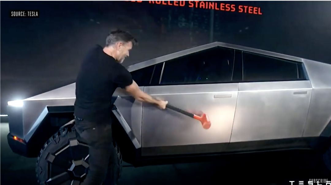 大家关心的续航售价放在最后,Musk 开场就邀请了一位壮汉,用大锤子来验证 Cybertruck 到底有多「硬」。