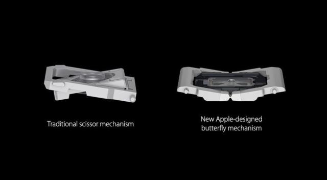 以往的剪刀脚形键盘已经无法满足苹果对超薄的追求,于是在2015年发布的12英寸MacBook上,拿出了蝶形键盘这一试错方案。按照苹果的说法,蝶形键盘改变了以往剪刀脚键盘的基础结构,不仅让键盘的厚度减少了40%,键帽面积也增大了17%,输入文字时会更加精准,按压时出现卡键的几率也得到降低。既能让电脑更轻薄,又能格外稳定,当时看来蝶形键盘似乎是轻薄本的完美解决方案。