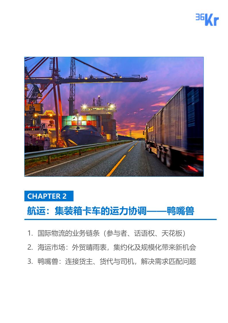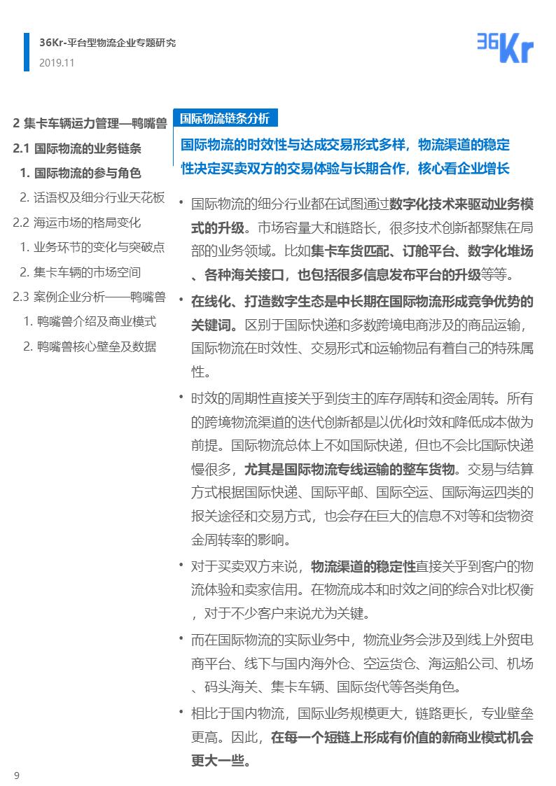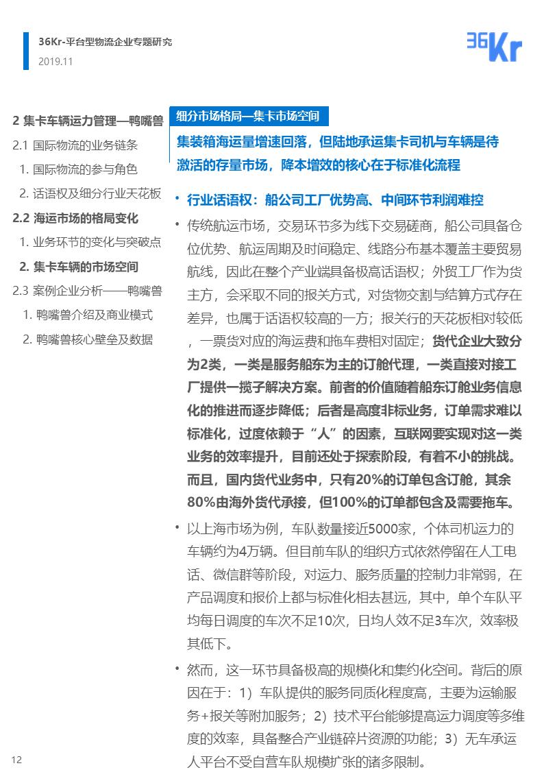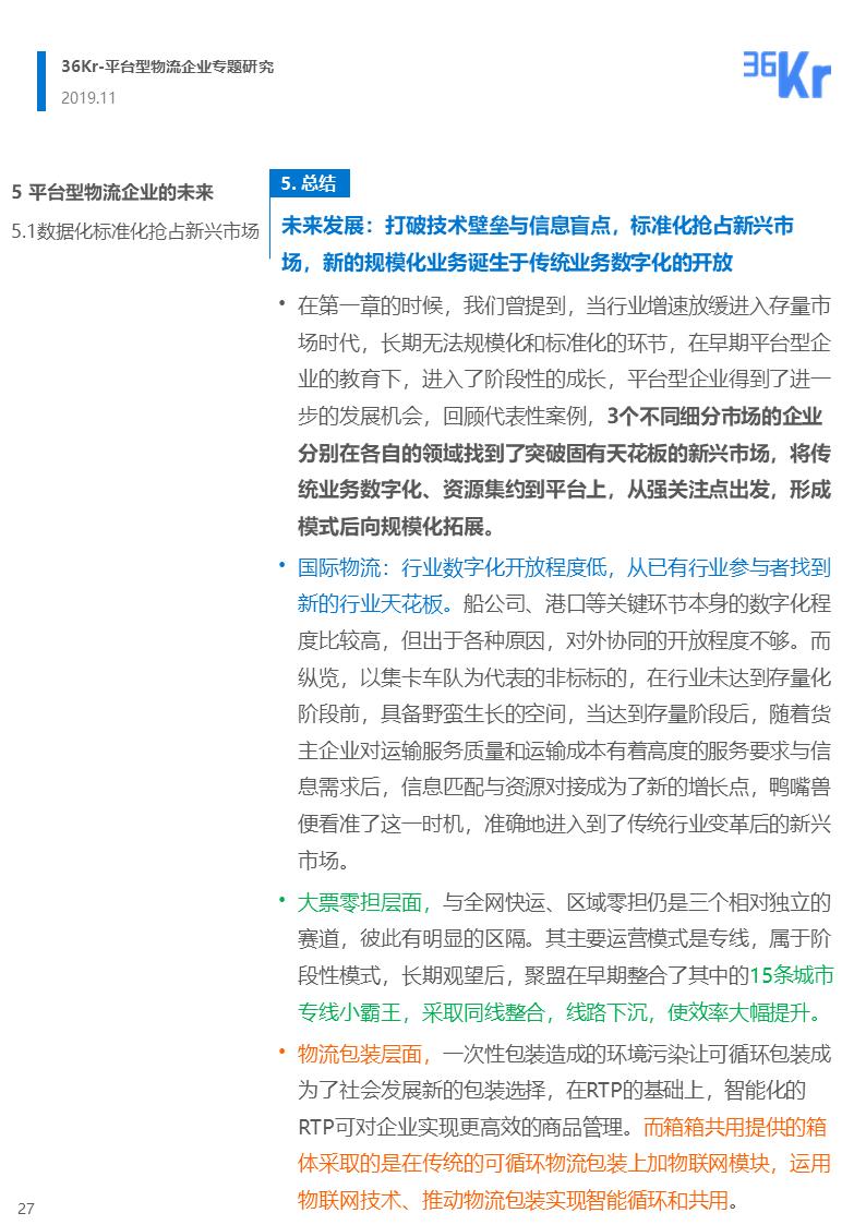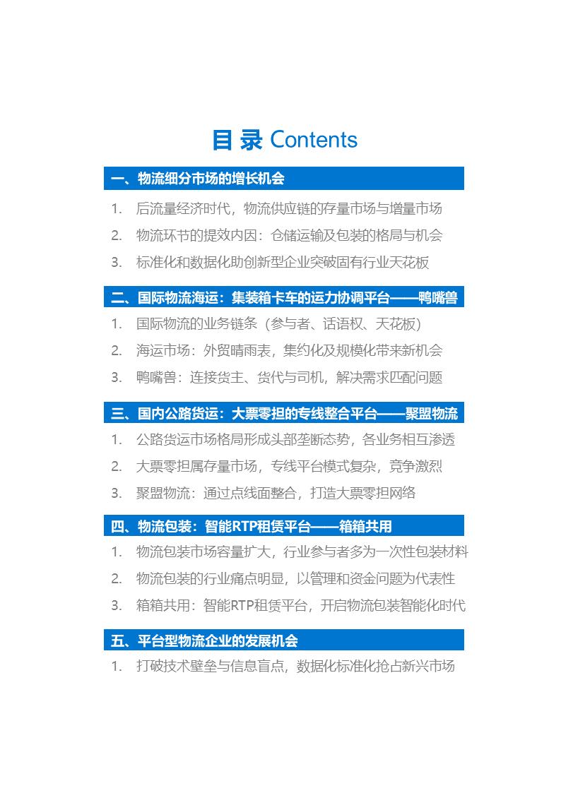 本报告分为五个章节,将分别从国际物流的集卡货运服务、大票零担的专线运输整合、智能可循环包装三个细分行业进行切入,对3家企业进行重点分析。输出我们对平台型企业成长性、主要业务模式、标准化与数据化过程、投资角度、未来趋势等多方面的观点。